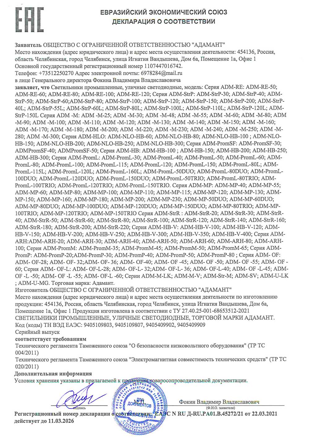 Светодиодные светильники серии «ADM-RE» предназначены для работы от сети переменного тока с напряжением 220 Вольт. Светильник светодиодный серии «ADM-RE» предназначен для замены светильников с лампами ДРЛ и ДНаТ; предназначен для освещения улиц, тротуаров, дворовых территорий, автомагистралей, складских и производственных комплексов. Светильник защищен от скачков напряжения до 400В. Консоль с антискользящим эффектом диаметром 55 мм. Срок службы 70000 часов.